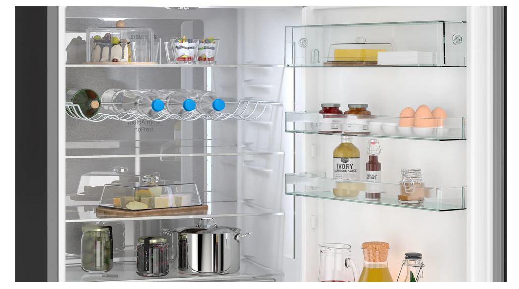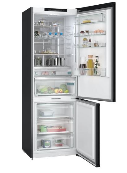 Doświadcz Siemens KG49NSBBF iQ700 Lodówko-Zamrażarka w eleganckim czarnym kolorze z matowymi szklanymi drzwiami. Innowacyjna szuflada hyperFresh Box utrzymuje świeżość owoców i warzyw na dłużej, a technologia noFrost eliminuje konieczność rozmrażania. Idealna lodówka dla nowoczesnych gospodarstw domowych!